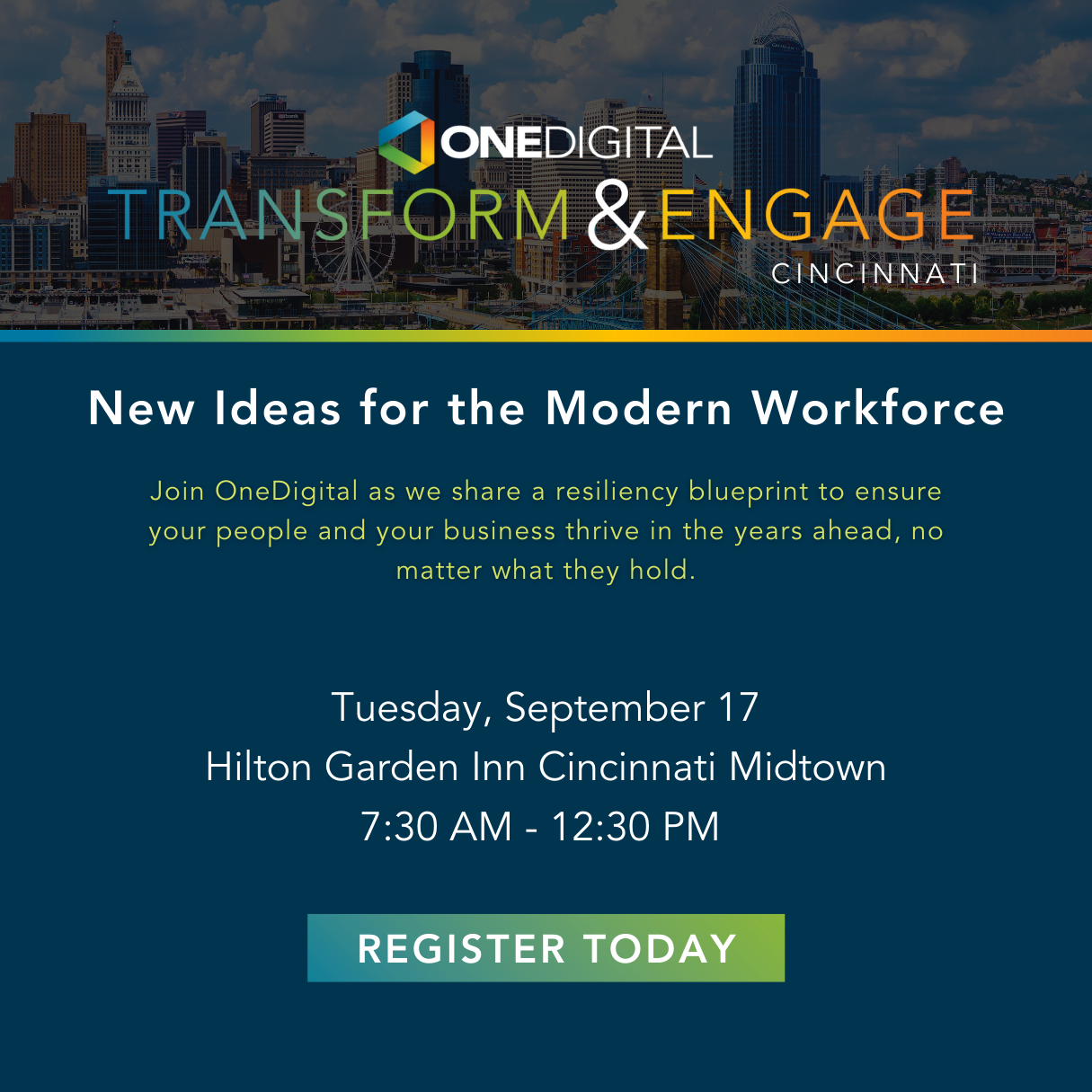 Cincinnati, OH – August 20 – We are so excited to bring this event to Cincinnati! As part of OneDigital, we are able to offer more resources and expertise, and Transform & Engage is an educational opportunity that will leave you feeling energized and inspired. We know how important it is to have resources that help you address the ever-changing challenges and risks that your organization faces. We are confident you will come away from this event with actionable insights that help you improve the wellbeing of your organization and your team.